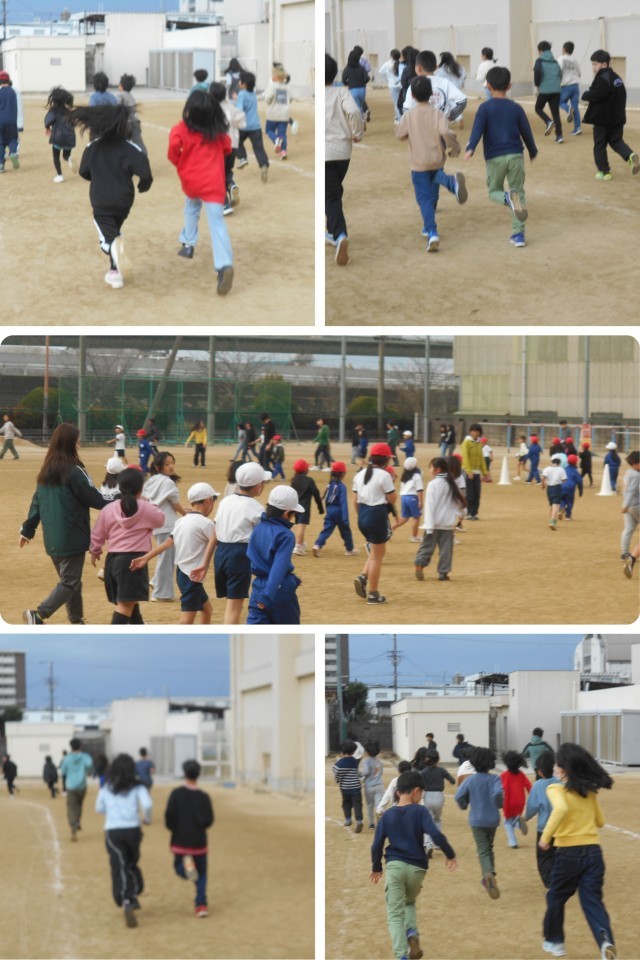 15分休憩になると、みんな運動場に出て準備体操を行います。音楽が流れると走りはじめます。「しんどい~」と言いながらも、「9周はしった!」「次はもっと走りたい」と意欲的な姿が多くみられました。