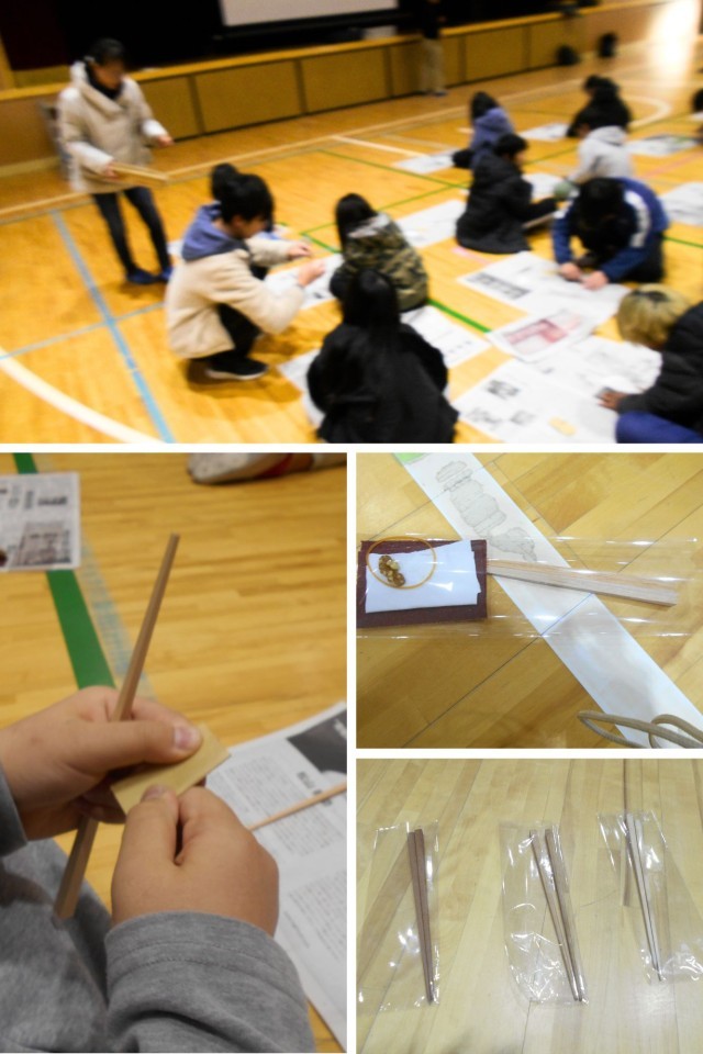 地域の産業である、木材を使って「お箸づくり」を行いました。やすりで削って自分の思っている箸を作ります。何度も見ながら「もう少し削ろう!」「いい感じにできた。」と言いながら友だちと楽しそうに取り組んでいました。出来上がった「マイ箸」を大切そうに持って帰りました。