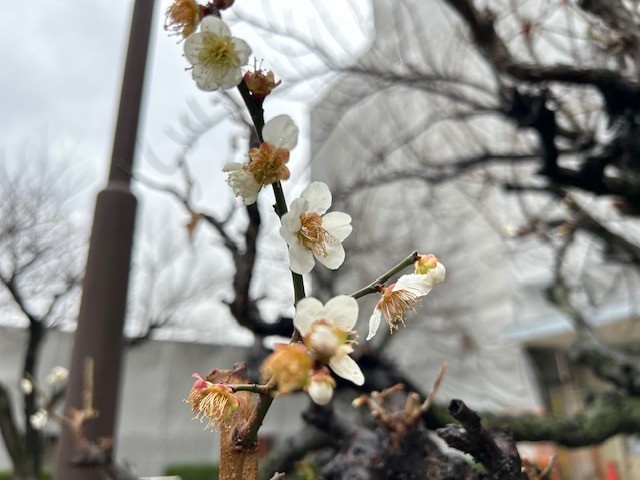 正門の梅の花がポツリ、ポツリと咲き始めました。
