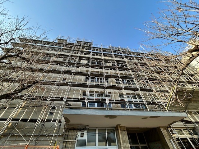 長寿命化工事のために覆われていた正門のシートの取り外しが