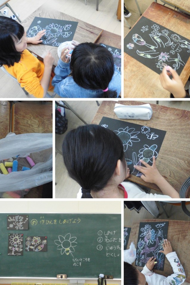 2年生が黒い画用紙に大きなお花を描いて、チョークを使って色を塗っていました。いろいろな形のお花に、チョークをこすってみたり、重ねてみたり、と工夫して描いていました。「赤色の上から黄色を塗るときれいになるよ」「このお花はピンクがいいな」と友だちと話しながら楽しそうに取り組んでいました。個性豊かなお花がいっぱいあって、どれも素敵な作品です。