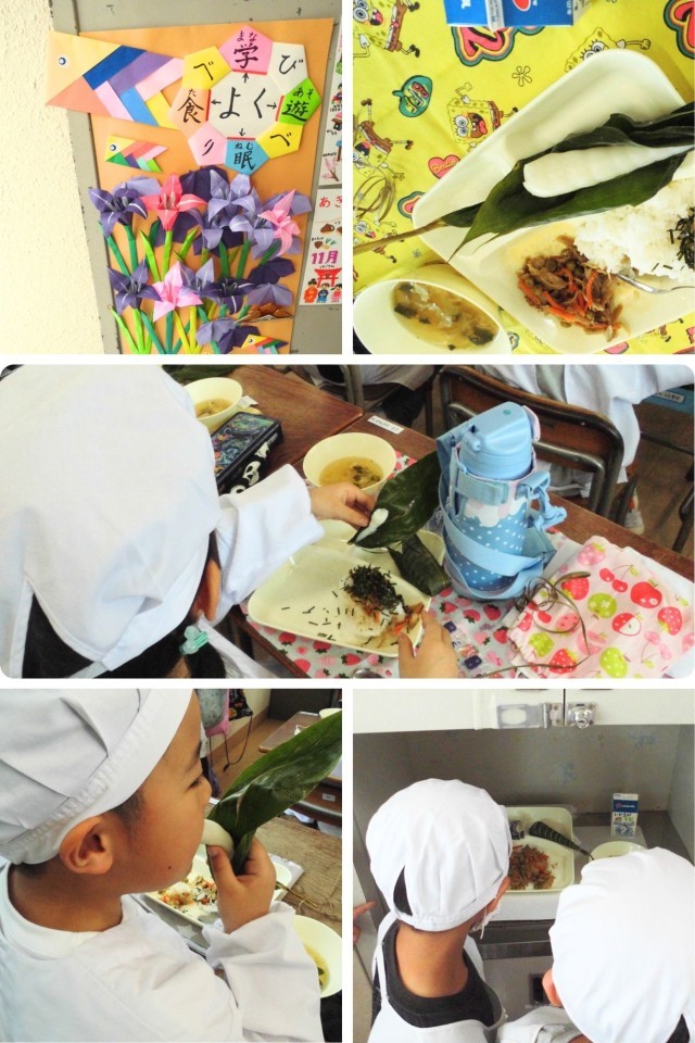 今日の給食は「こどもの日の行事献立」でした。献立はきんぴらちらし・五目汁・ちまき・牛乳でした。給食室の前に、あやめやこいのぼりの折り紙の作品が掲示がされていました。そして、給食当番が給食室に入ると「ちまき」を見て、びっくり!「何これ~?」と調理員さんに尋ねる様子も見られました。