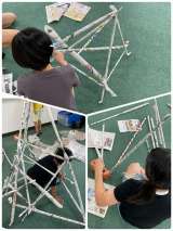 新北ルームでは4年生が新聞紙を使って棒状にして造形あそびをしていました。「タワー...