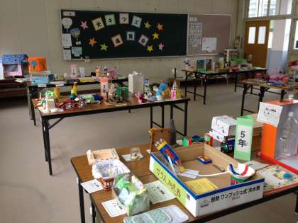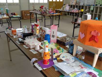 夏休みに子どもたちがつくった作品の数々を展示しています。8日から12日まで、3階の生活科室において午後3時から5時まで開催しております。ぜひ、力作をご覧いただきたいと思います。