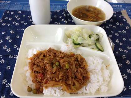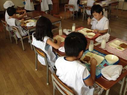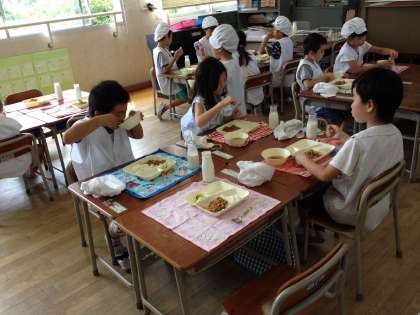 今日の給食は、昨年度の学校給食献立コンクールで最優秀賞をとった献立でした。東成区の神路小学校6年1組のみんなが考えた献立です。内容はタコスライス、もずくと白ネギのスープにグリーンサラダという夏メニューでした。タコスライスはカレー風味で食欲がアップするように工夫されていました。1年生も、しっかりと食べていました。
