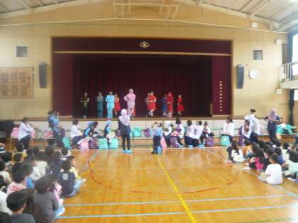 4月22日(月)、マレーシアから小学生30名が本校を訪問し、交流会を行いました。はじめに全校児童が講堂に集まり、マレーシア児童をむかえました。本校からは校歌の合唱のプレゼントをし、マレーシアからは踊りの披露がありました。その後、本校の5年生との遊びの交流会を行いました。はじめはけん玉、メンコ、竹とんぼの日本の遊びの交流です。