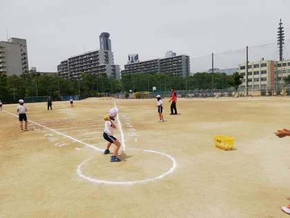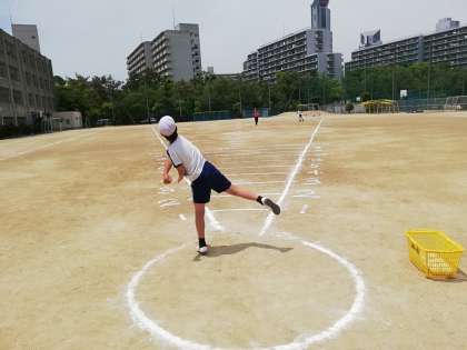 5月も半ばになり、体力テストの時期になりました。運動場ではソフトボール投げをする姿が見られました。投げる角度を工夫したり、少しでも遠くに投げようと努力していました。