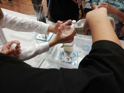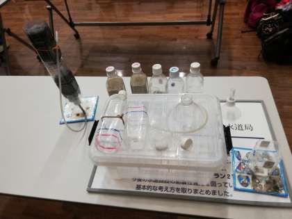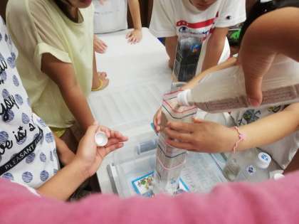 ビデオのあとは水をきれいにする実験です。砂を2重にペットボトルに入れます。
