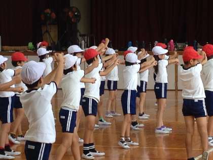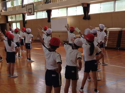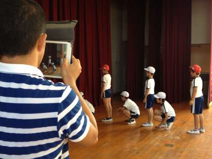 3年生は、各グループごとにタブレットPCで撮影をしました。他のグループのいいところを見つけたり、自分たちの演技をみて、さらに改善したりする有効な方法です。細かなところまでチェックして、演技に磨きをかけていきます。