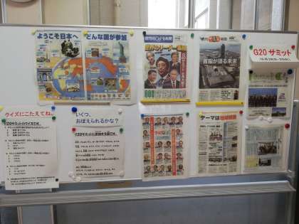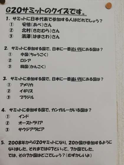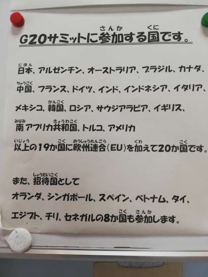 G20サミットが来週になり、警備が日ごとに厳しくなってきました。この国際会議が身近で開催されることは、最初で最後かもしれません。子ども達に少しでも関心を持ってもらおうと玄関に掲示をしています。クイズもあります。ぜひ解いてみてください。答えは来週の月曜日の夕方にHP でお知らせします。