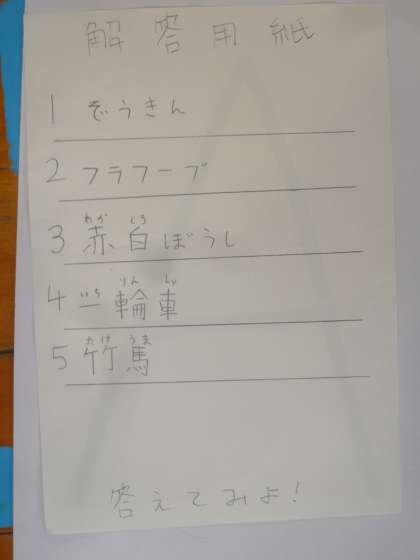 7月4日(木)の児童集会で「物あてゲーム」をしました。舞台のカーテンのすき間を通る物をたてわりグループで相談して当てるゲームです。雑巾など実際の物だけでなく、竹馬や一輪車に実際に乗ってすき間を通る場面もあり、楽しく笑いを誘うゲームでした。