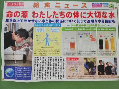 校内にいくつかあります。ご家庭でも気を付けてあげてください。その掲示物を見るとジュース類は糖分が多く、緑茶は利尿作用があるので、水分補給には適さないそうです。