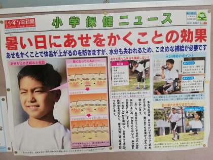 梅雨に入り、蒸し暑さが続いています。水分補給の大切さを説明している掲示物が