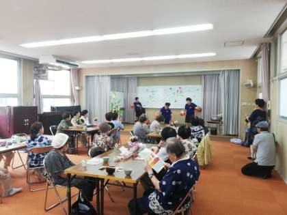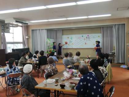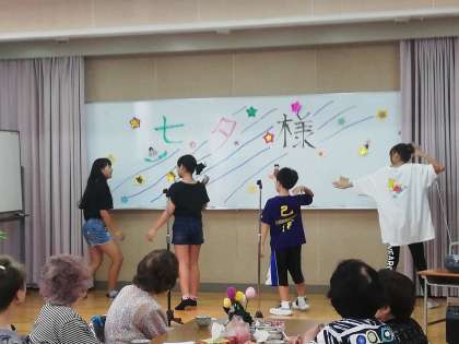 7月6日(土)の地域の定例の食事サービスに、6年生がグループで得意技を披露しました。まずはダンスと男女のバスケットボールです。