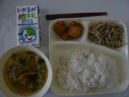 7月8日(月)、七夕も終わり、蒸し暑い1日になりました。今日の給食は沖縄料理の「ゴーヤチャンプルー」「すまし汁」「あつあげのしょうがじょうゆかけ」でした。「チャンプルー」とは沖縄の方言で「ごちゃまぜ」という意味だそうです。「夏野菜の王様」と言われるにがうり(ゴーヤ)を使った栄養満点の料理です。