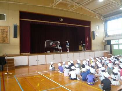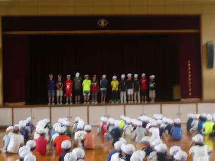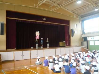7月11日(木)、児童委員会の運動委員会が発表を行いました。鬼ごっこのルールやボール遊びで気を付けることなど、安全に遊んだり運動したりすることをわかりやすく説明していました。大きな「チコちゃん」の絵も登場し、楽しい発表になりました。