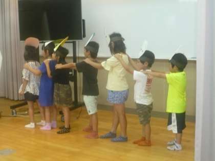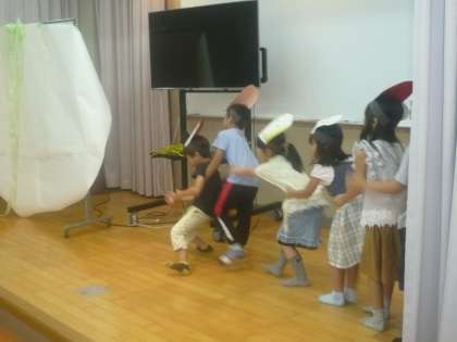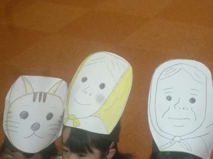 1年生は国語科で学習した「大きなかぶ」のまとめとして、グループで劇にして発表し合いました。セリフを大きな声で言ったり、かぶをみんなで力を合わせて引っ張る様子を上手に体で表現していました。頭には猫やねずみの面を付けて役になりきって頑張っていました。