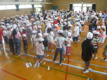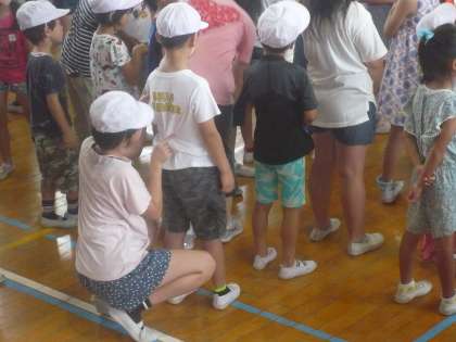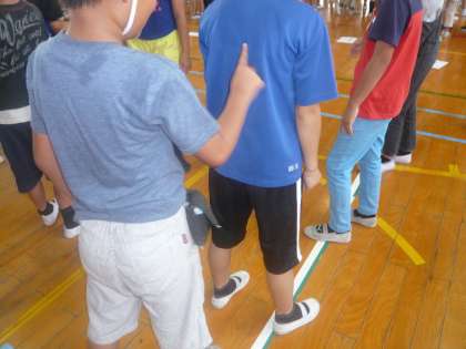 7月18日(木)、1学期最後の児童集会がありました。ゲームは「背中で伝言ゲーム」といって、グループで決められたひらがなを順番に背中に書いていき、言葉を当てるゲームです。子どもたちはわかりやすいように次のメンバーの背中にひらがなをかいていました。言葉の答えは「な・つ・や・す・み」でした。