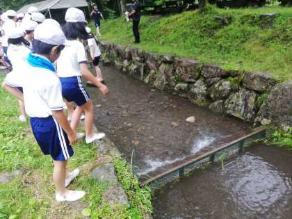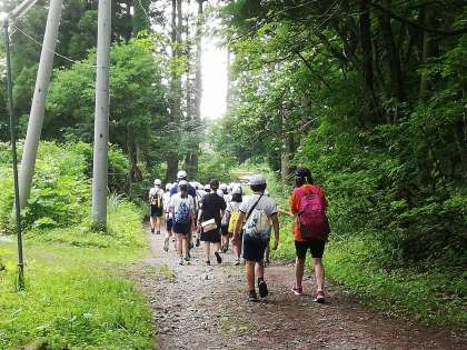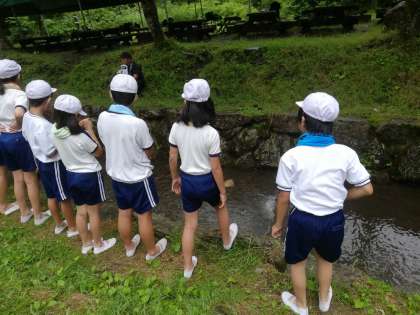 魚つかみの活動です。林を抜けて川に向かいます。雨が激しくなったので雨宿りの後、いよいよ魚つかみの開始です。