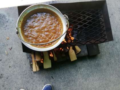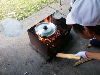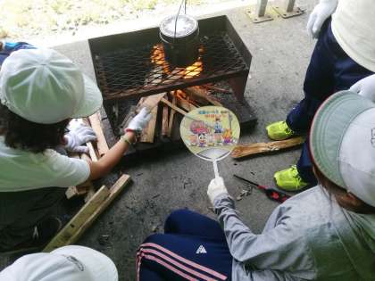 カレーづくりでは火をおこすのにどの班も苦労しました。やがて燃える火の上で飯ごうのご飯と鍋のカレーができていきました。