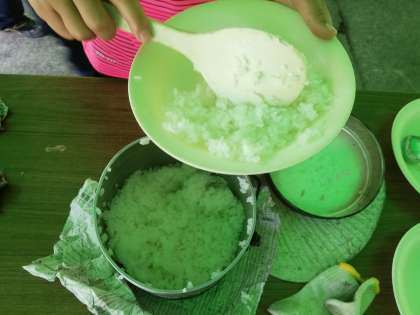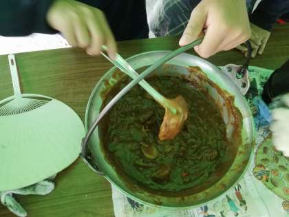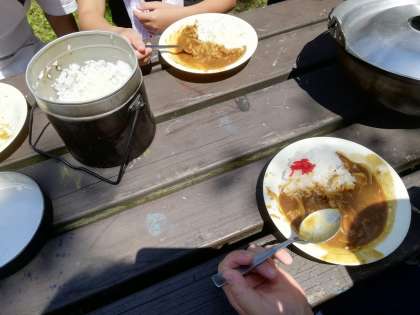 カレーが出来上がりました。班の分を皿に盛り付け、「いただきます」です。