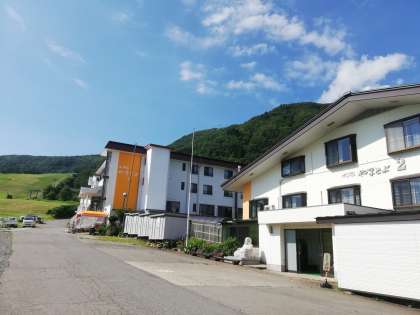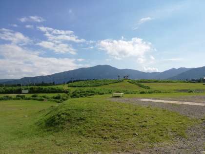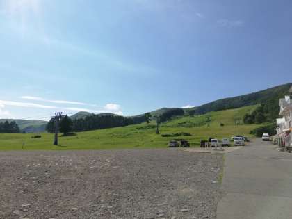 高原が晴れ渡り、きれいな景色が見事です。宿舎「やまとよ2」の奥の山が先ほど登った鉢伏山です。