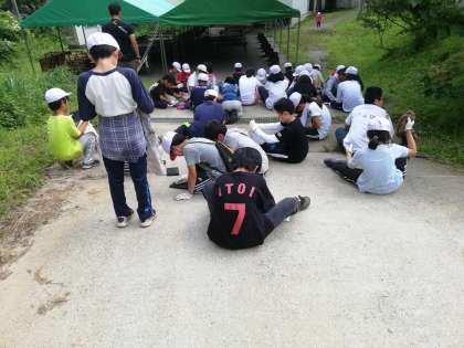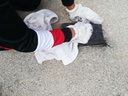 食器洗いのあとは焼き板作りです。まず、焼き板のすすを古布で落とし、磨きます。なかなかすすが落ちず、顔をすすだらけになる子ども達もいて、楽しい雰囲気でした。