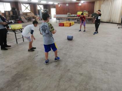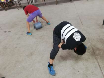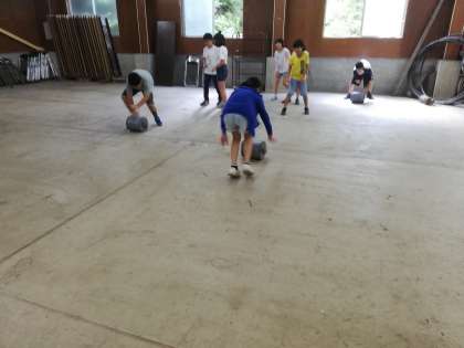 回転容器の転がしは楽しい作業で、思い思いの方法で転がしていました。