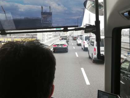 15時55分、阪神高速池田線の豊中南から渋滞です。故障車渋滞で塚本まで6?渋滞です。ノロノロ運転で時間がかかりそうです。到着予定の16時半には着かないと思います。みんなはディズニーのDVD を見ています。
