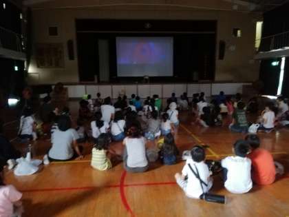 7月28日(日)、本校講堂で映画「グリンチ」の鑑賞会があり、続いて運動場で天体観測を行いました。主催は「太陽はぐくみ活動委員会」と「太陽校下青少年指導員会」です。かき氷も食べることができ、子ども達は大喜びでした。土星は環を見ることができ、木星は模様や惑星がはっきりわかりました。子どもだけでなく、大人も感動していました。