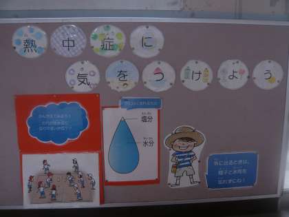 8月29日(木)、少し気温が下がって猛暑から解放された日が続きましたが、今日はとても蒸し暑い日になりました。子どもたちは水分を適時とりながら、熱中症にならないように気を付けています。保健室前には熱中症予防の掲示物を貼って、予防に努めています。