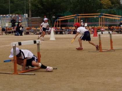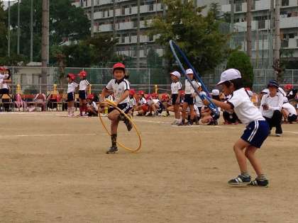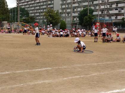 1・2年生のリレー競技でした。輪やハードルをくぐりぬけて、リングをつないでいきました。1年生もしっかりとした走りをみせてくれました。