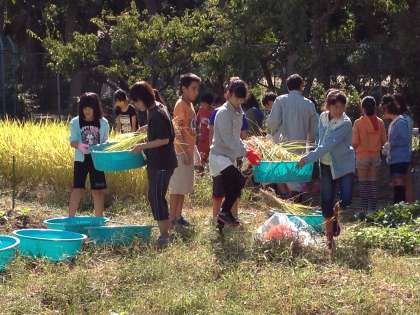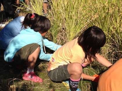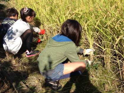 5年生が植えた苗はすくすくと育ち、実りの秋を迎えました。8日にはいよいよ稲刈りです。鎌を使うのはみんな初めての経験でしたが、じょうずにあつかっていました。