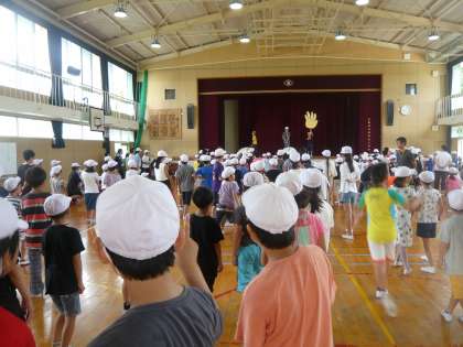 今日の児童集会は「ジャンボジャンケン」でした。たてわりグループで何を出すか相談してジャンケンを楽しみました。なお、今日は3年生〜6年生はプールおさめでした。明日の1年生・2年生で今年のプールは終了します。