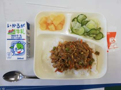 今日の給食は「大豆入りキーマカレーライス」「グリーンサラダ」とデザートに白桃が出ました。カレー粉は米粉で、小麦アレルギーに配慮しています。ドレッシングはノンエッグで卵アレルギーに配慮しています。