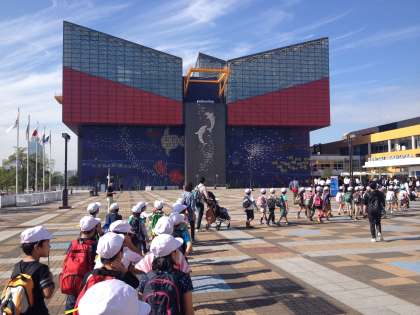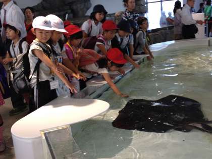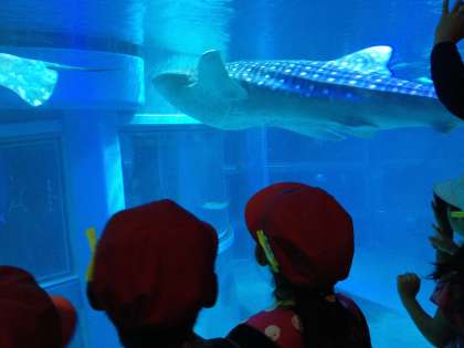 1・2年生は10日、遠足で海遊館に行きました。たくさんの学校が来ていて、館内は人がいっぱいでした。それでも、イルカやアシカ、ジンベイザメが気持ちよく泳いでいる姿をみて、大喜びでした。エイやサメに触ることができるコーナーでは、怖がらずに手を水槽に入れていました。「エイはぬるっとしてたけど、サメはざらざらしてた」と感想を話してくれました。