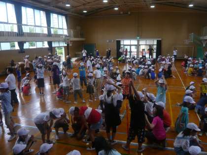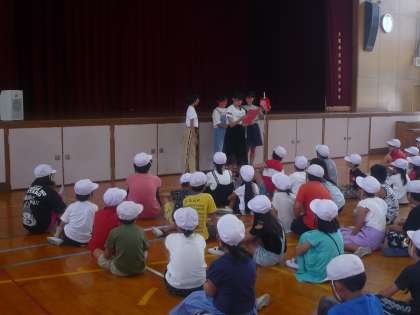 9月12日(木)、今日の児童集会は「たけのこ にゅっき」ゲームでした。たてわり班で号令に合わせてたけのこのポーズで立っていくゲームです。同時に立ったり、最後まで残ったらアウトになるので、子どもたちは班の友達の様子をよく見ながら考えて立っていました。
