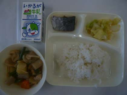 今日の給食は「さごしの塩焼き」「じゃがいもと一口がんもの煮物」「キャベツのおひたし」でした。「さごしの塩焼き」は子どもたちの人気メニューの一つです。