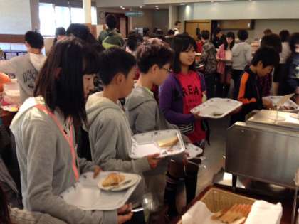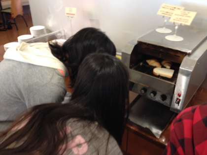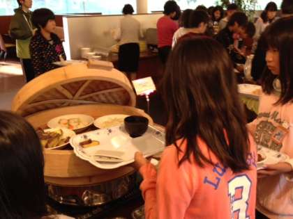 モーニングビュッフェもみんな大喜び。コンベア式のトースターがめずらしいのか、パンが焼けて落ちてくるまで、じっと見ていました。