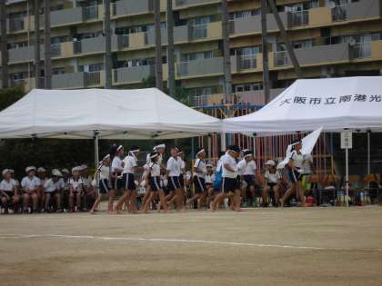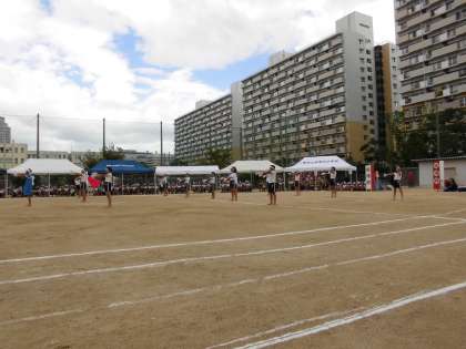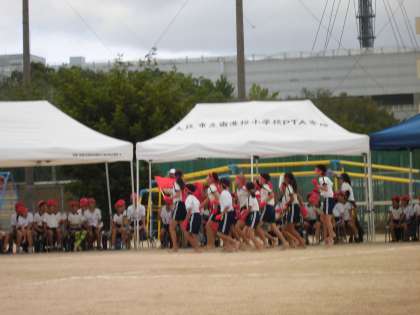 午前の応援合戦です。応援団は大きな声で盛りあげました。それにこたえて全学年児童も元気に応援をしていました。自分のチームが勝つように気持ちがこもっていました。