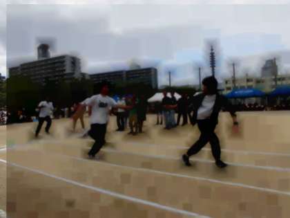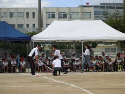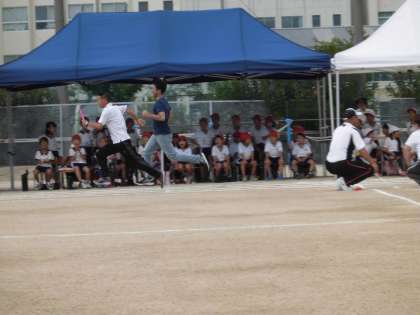 運動会の様子です。午後の部から再開です。まず、PTA競技のリレーです。保護者・教職員だけでなく、卒業生も参加して大いに盛り上がりました。子どもたちからも熱い応援があり、みんな全力で力走しました。