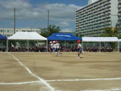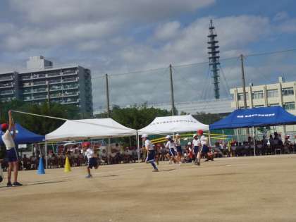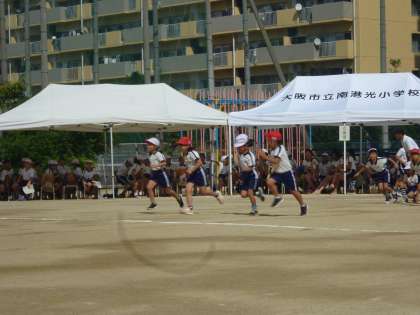 運動会の様子の続きです。1年生の個人走「ランランラン」です。小学校初めての徒競走ですが、みんな張り切って走り切りました。1年生でも、走る姿勢はかっこいいです。