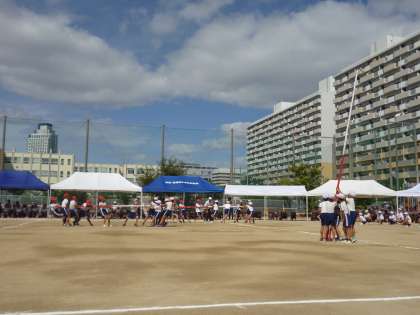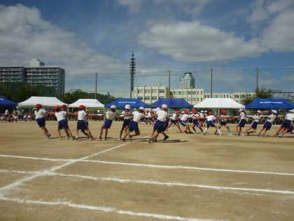 4年生の団体競技「棒ーと引いてんじゃねえよ」(棒引き)です。なかなかの白熱した接戦が続き、大いに盛り上がりました。「ぼーっと」引いている子は一人もいない熱戦でした。