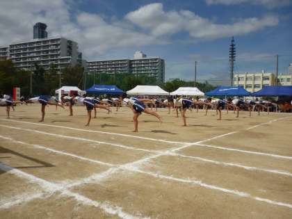 いよいよ、5年生・6年生の団体演技「和〜未来へ繋がれ」(組立体操)です。タワーやピラミッド等の危険な技が禁止されているので、組み立て体操の構成に苦労をしましたが、子どもたちは猛暑に負けずに練習を積み重ねてきました。まずはブリッジ等の一人技です。