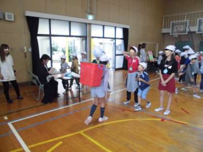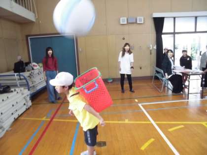 続いて、PTA地域体育厚生委員会の「背中でキャッチ」です。ボールを床に弾ませ、上に上がったボールを背中に背負ったかごに入れます。子どもたちはボールをキャッチしようと動き回ります。難しいですが、見事にボールが入った時の笑顔が素敵でした。