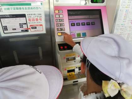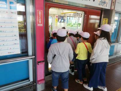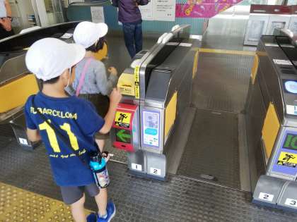 10月23日(水)、2年生は社会見学で、ニュートラムの南港検車場に行きました。まずは、自分で切符を買って、改札を通ります。