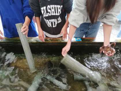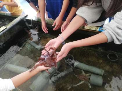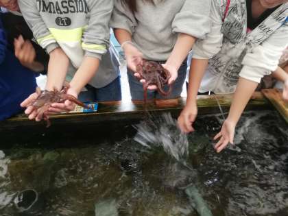 鳥羽水族館水族館ではいっぱいの魚や動物をグループで自由に回りました。タコを触ることができるコーナーは大人気で、見ていた幼児に触らせてあげる優しさもみられました。写真の管の中にタコが隠れています。