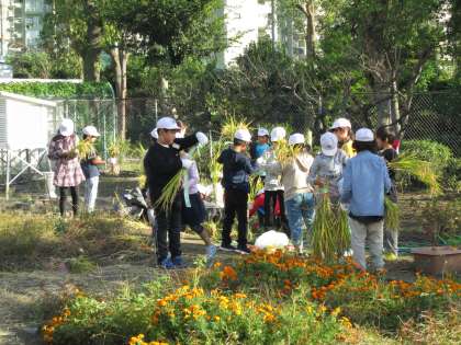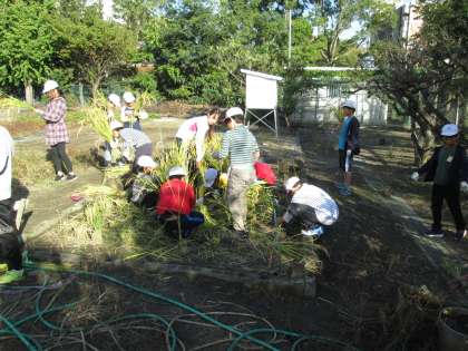 5年生が、10.28 秋晴れのもと、南港光小学校内にある学習園で、丹精を込めて育ててきたお米を収穫しました。今年は、例年以上に豊作で、子どもたちは、たくさん獲れて大喜び。収穫したお米は、すずめに食べられないように校内で干しています。