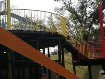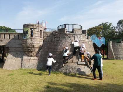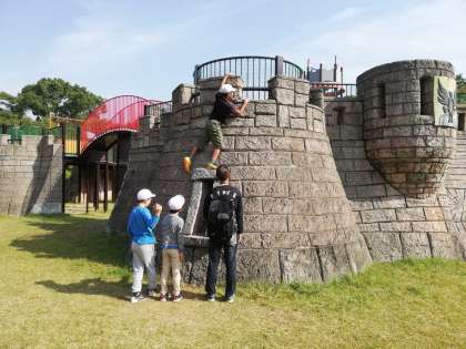 とりでの壁登りに挑戦する子もいます。下で先生が見守ります。