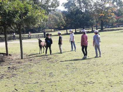 若草山に着きました。きれいな芝生の上で、鹿とたわむれます。
